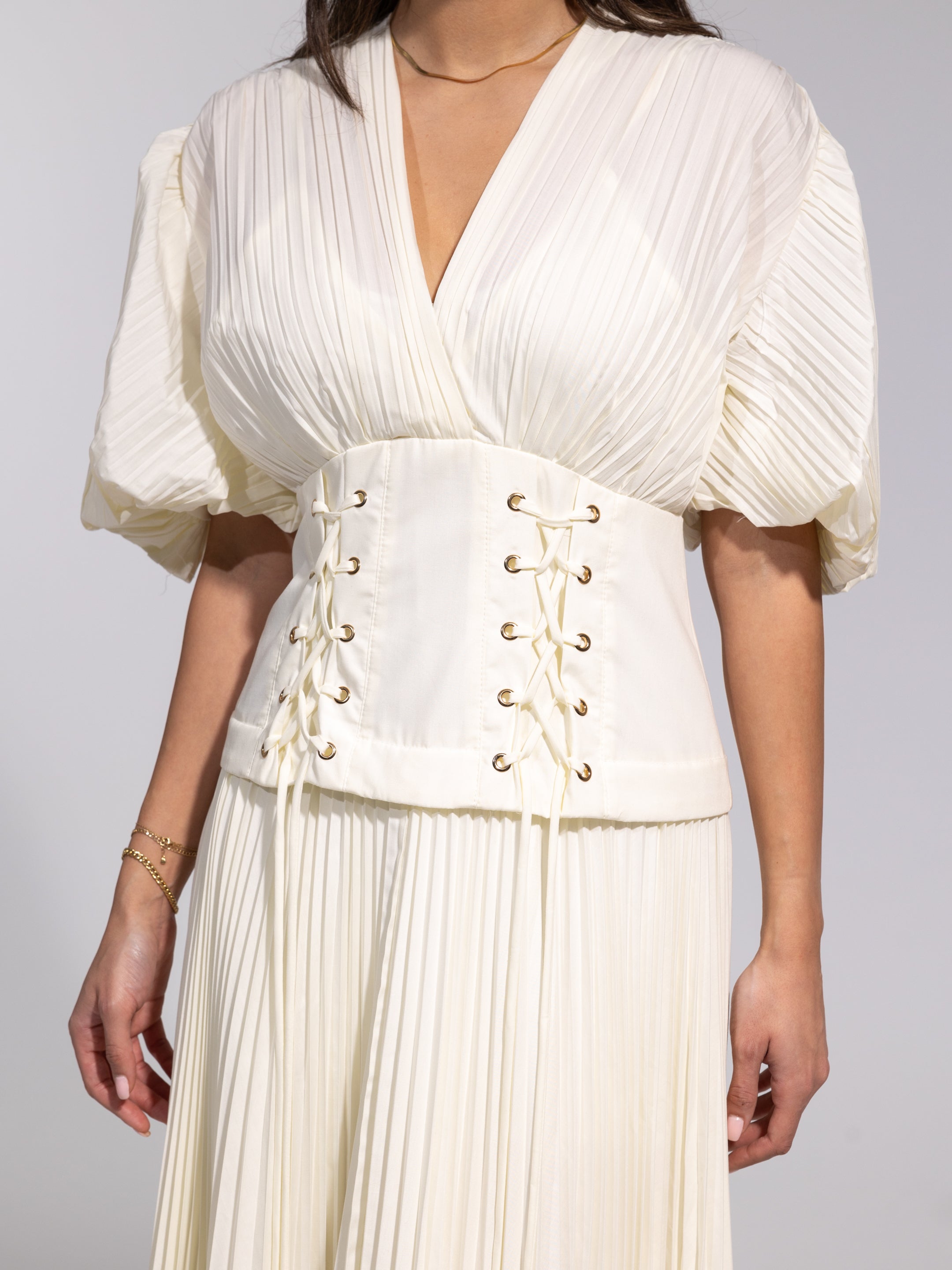 • Details: Soft puff sleeves, lace-up corset detail, elegant movement