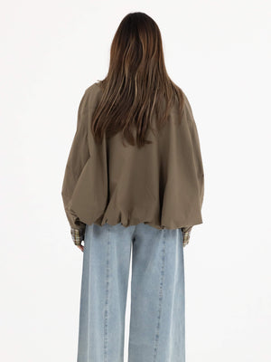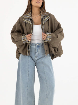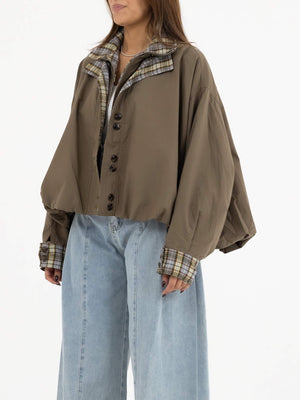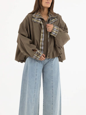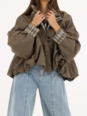 - Details: Front zip closure, button details, statement sleeves, plaid inner edges