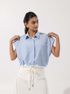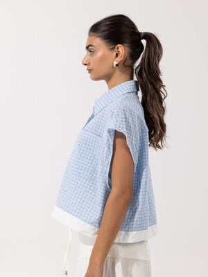 - Color: Light blue check with white hem trim.