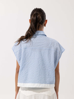 - Design: Sleeveless button-down vest with a crisp collar and boxy shape.