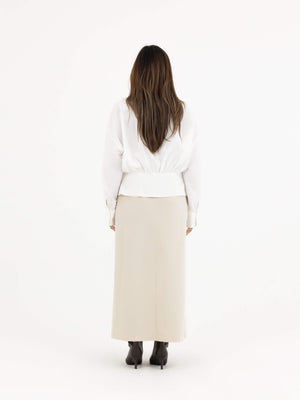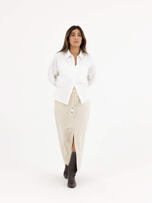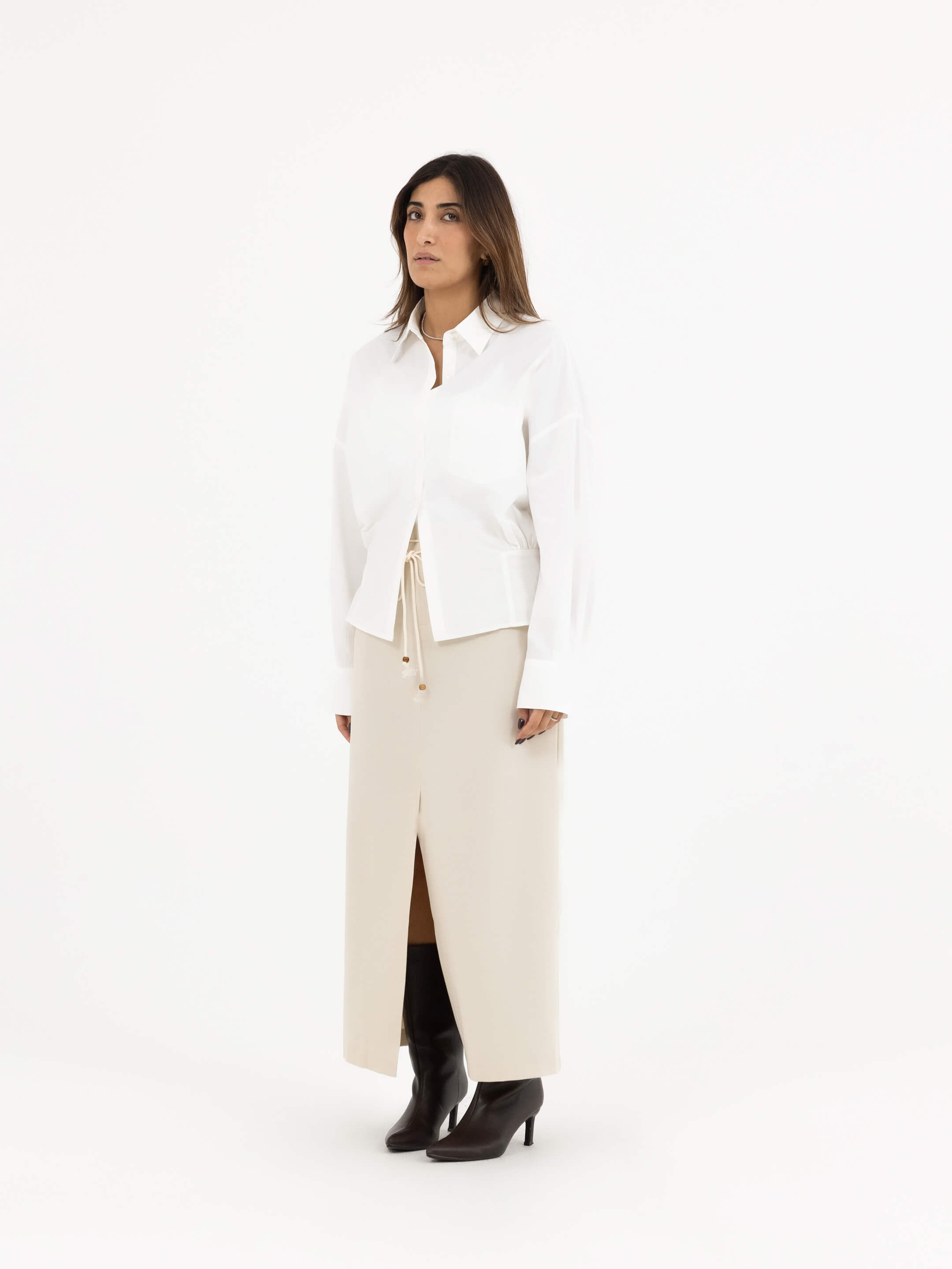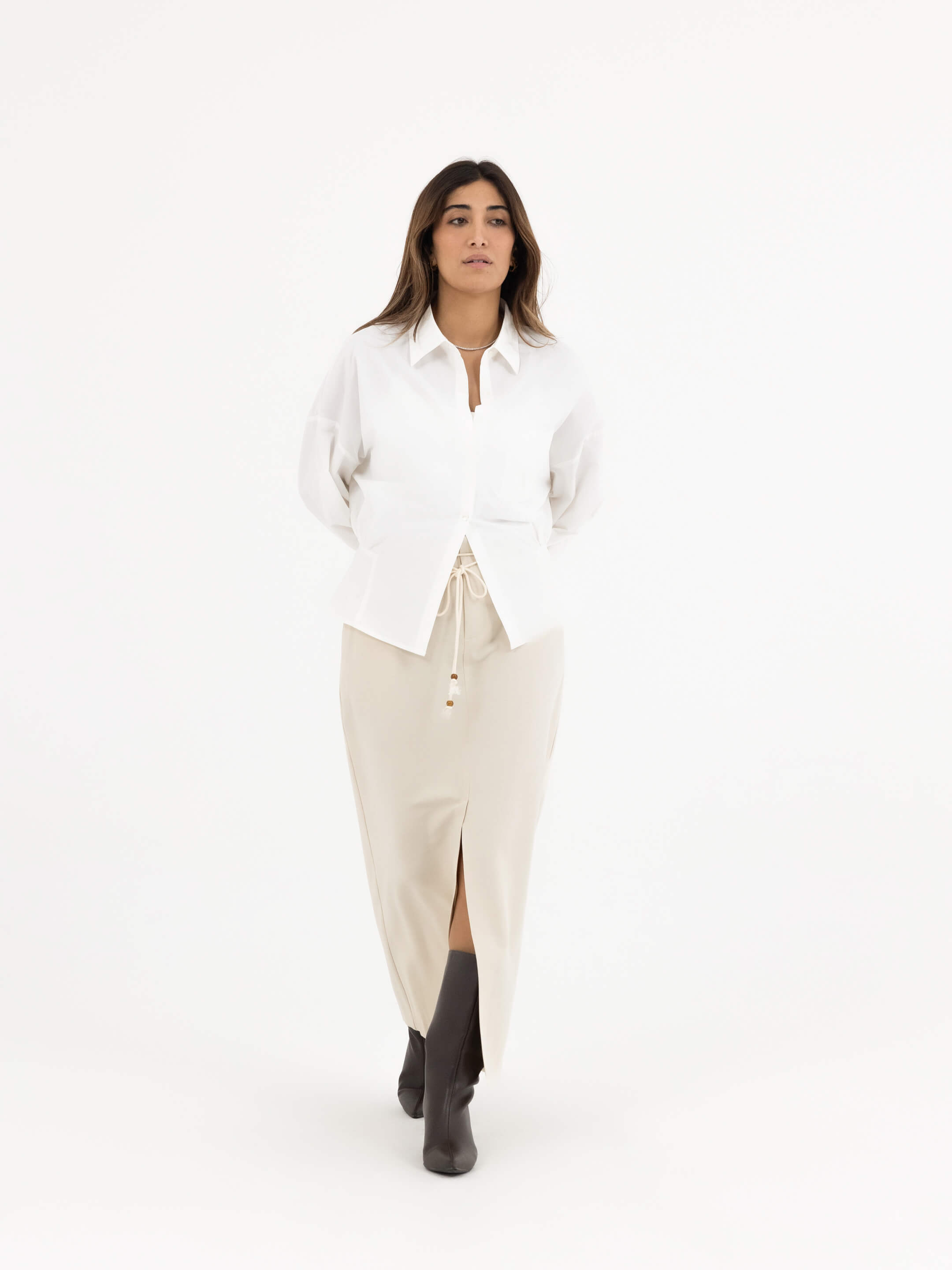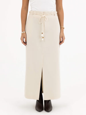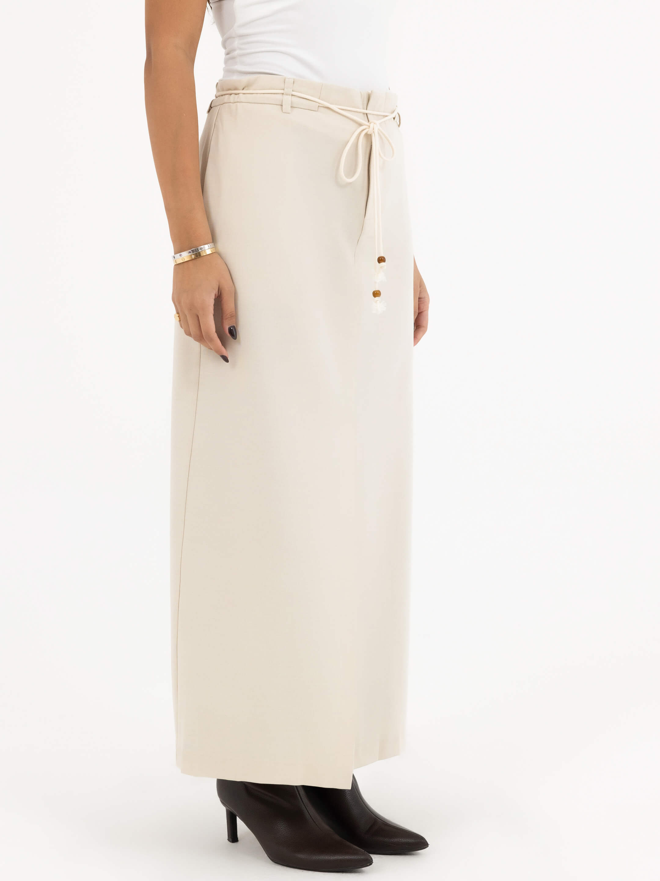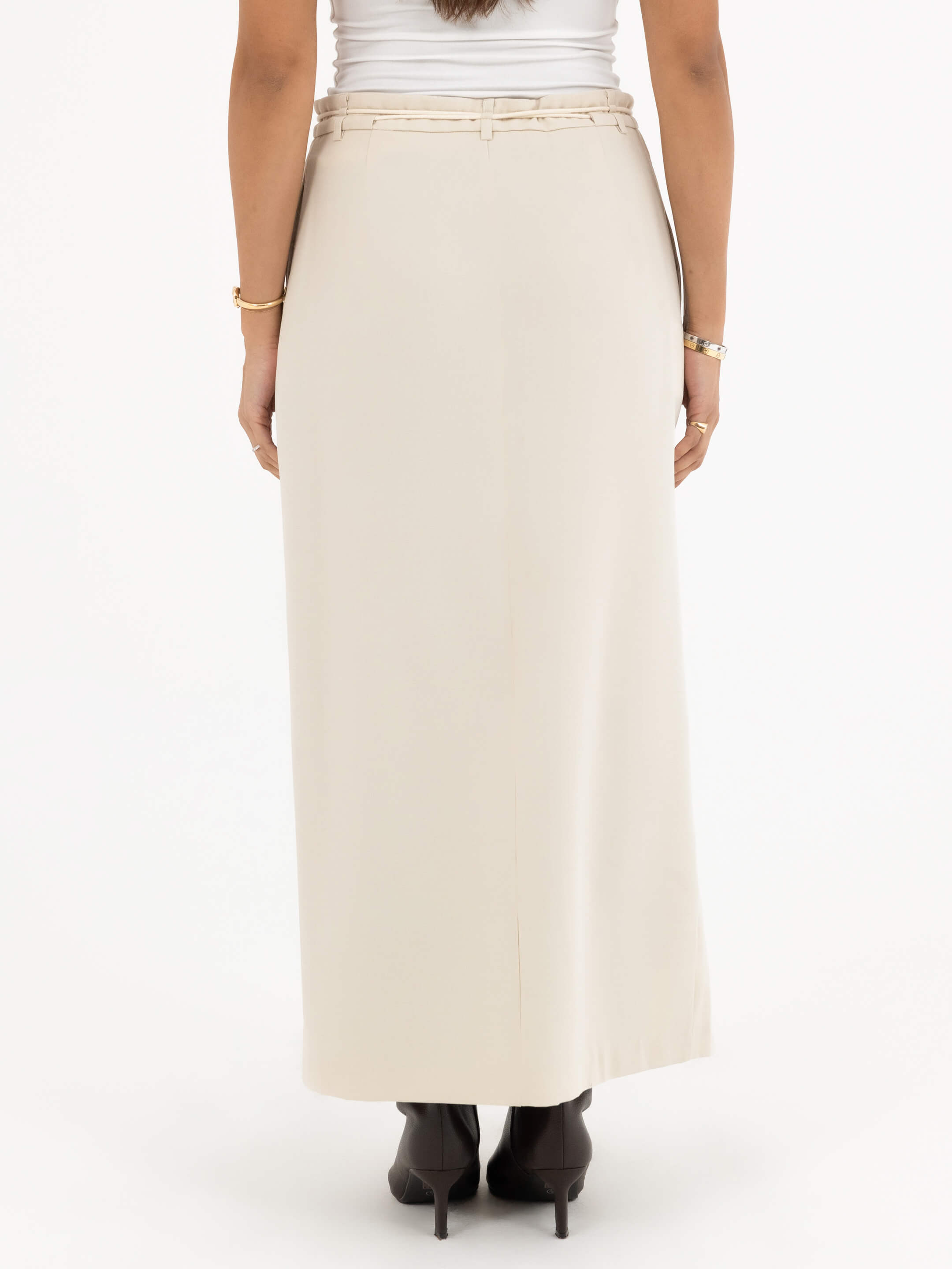 Design: Clean maxi skirt with front slit and adjustable waist tie
