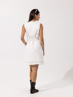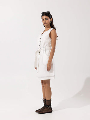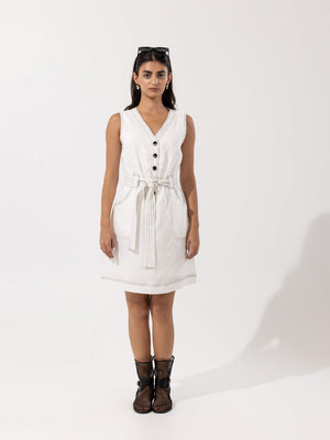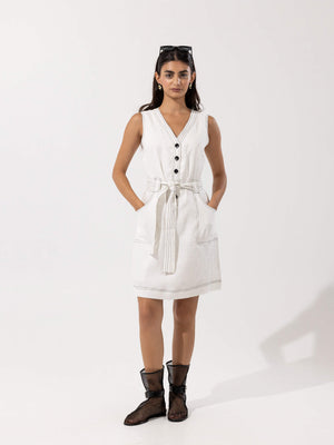 - Design: Sleeveless V-neck dress with front button closure and self-tie belt
