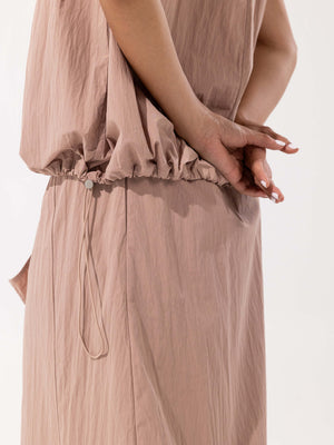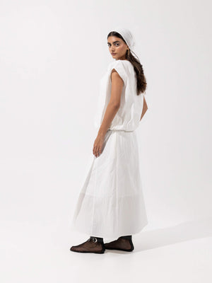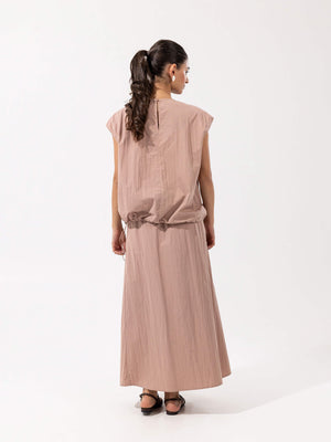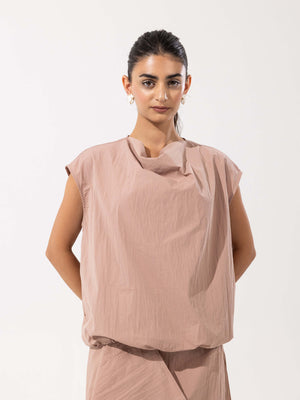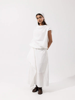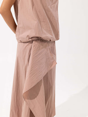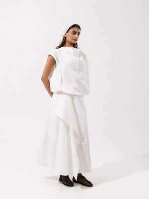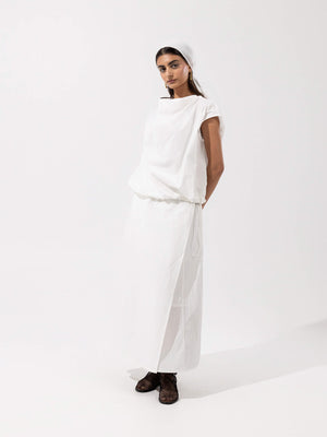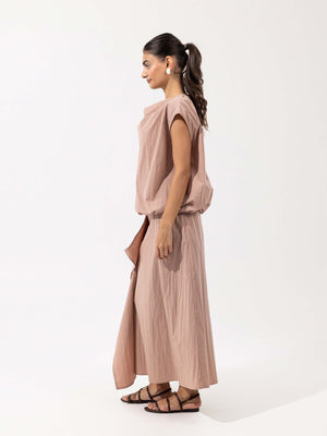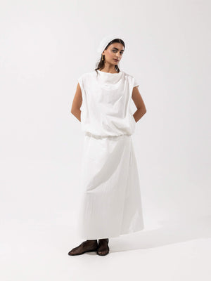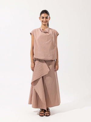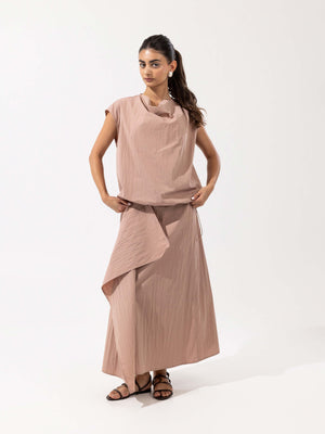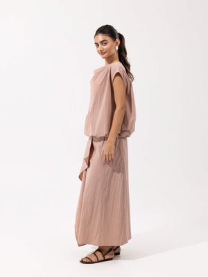 - Design: Two-piece set with draped sleeveless. top and an A-line maxi skirt with an asymmetric overlay.