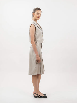 - Details: Vest with lapel collar, front button and flap pocket. High-waist shorts with front pleats and side pockets