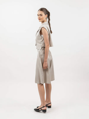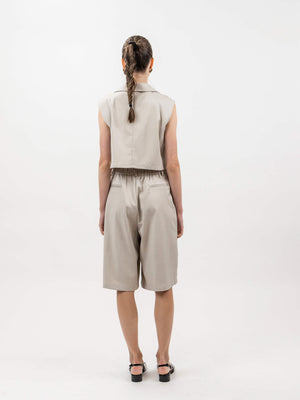 - Design: Two-piece set with cropped vest and pleated bermuda shorts