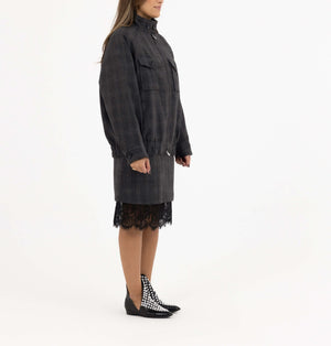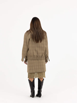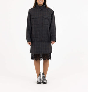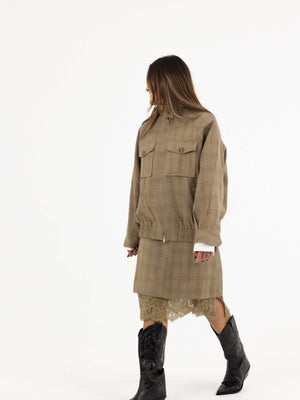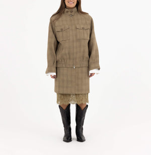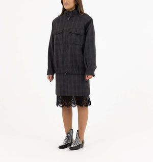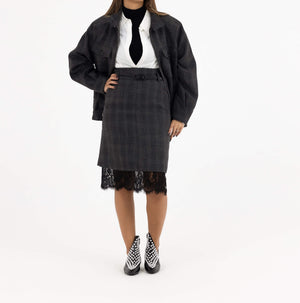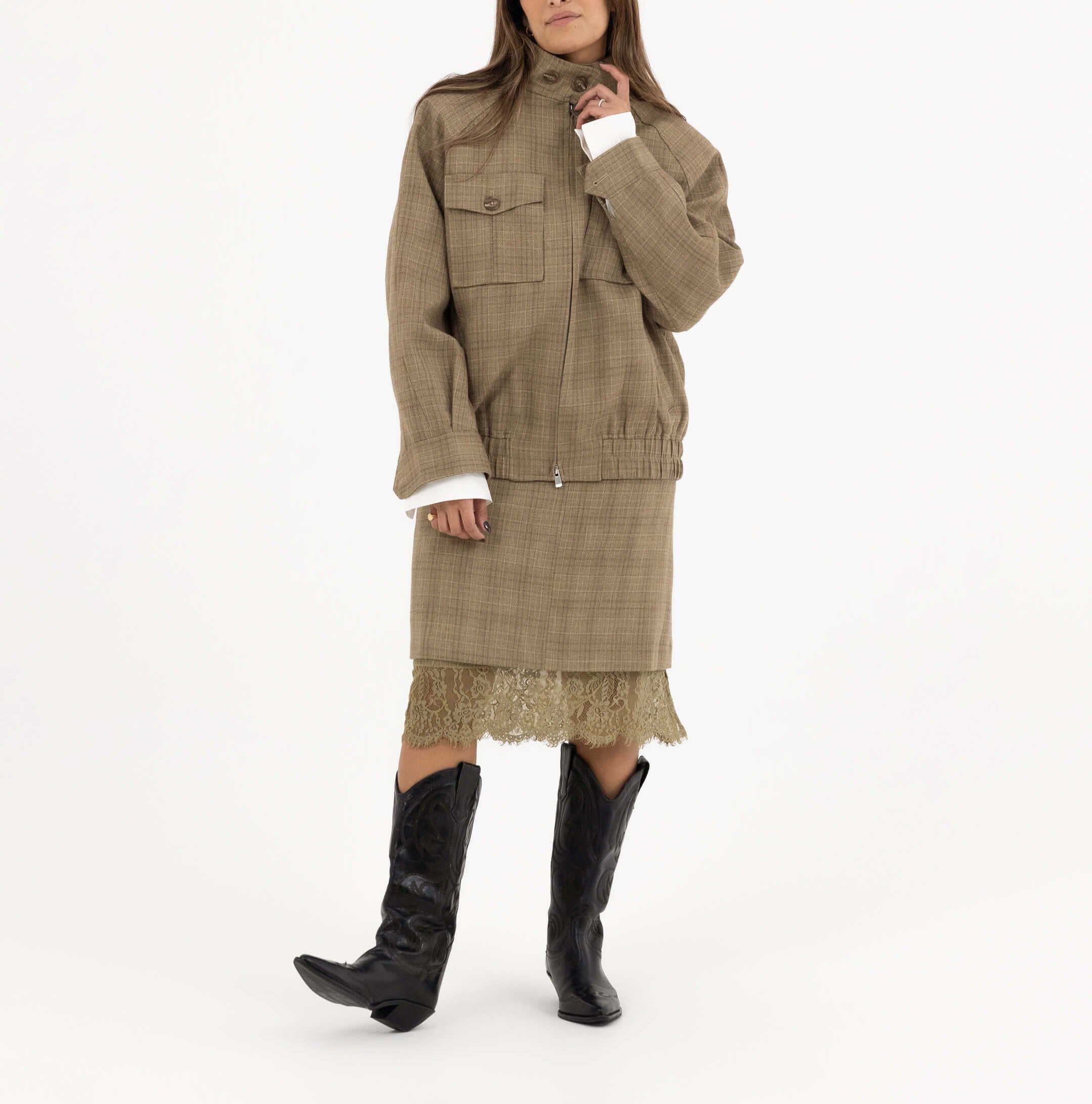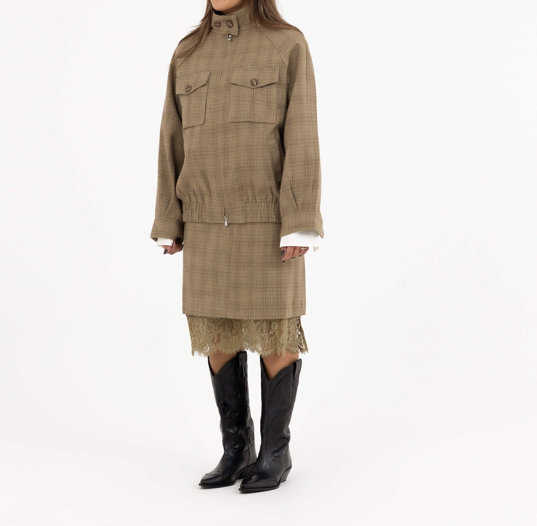 • Design: High-neck zipped jacket with matching lace-trim skirt
