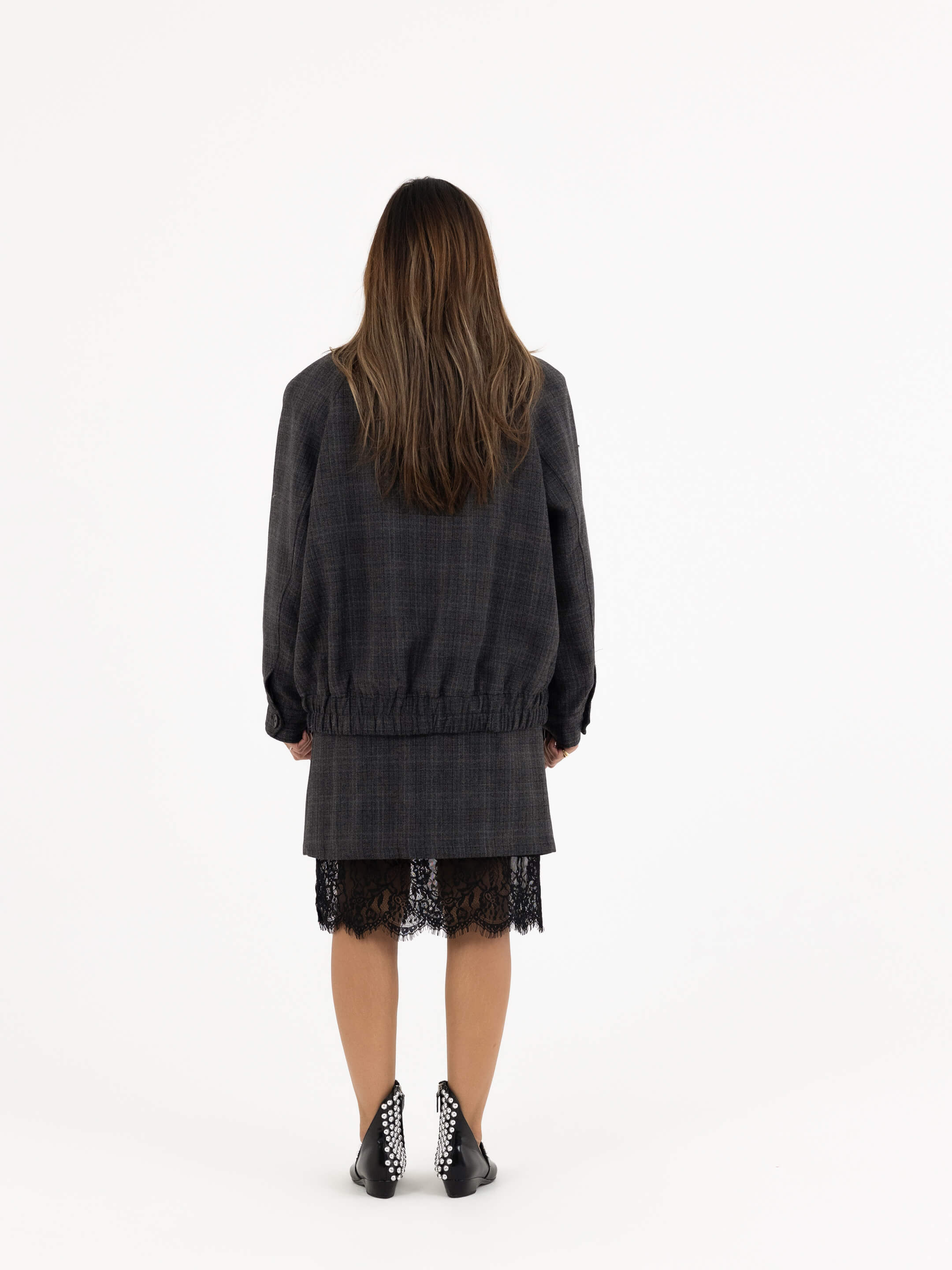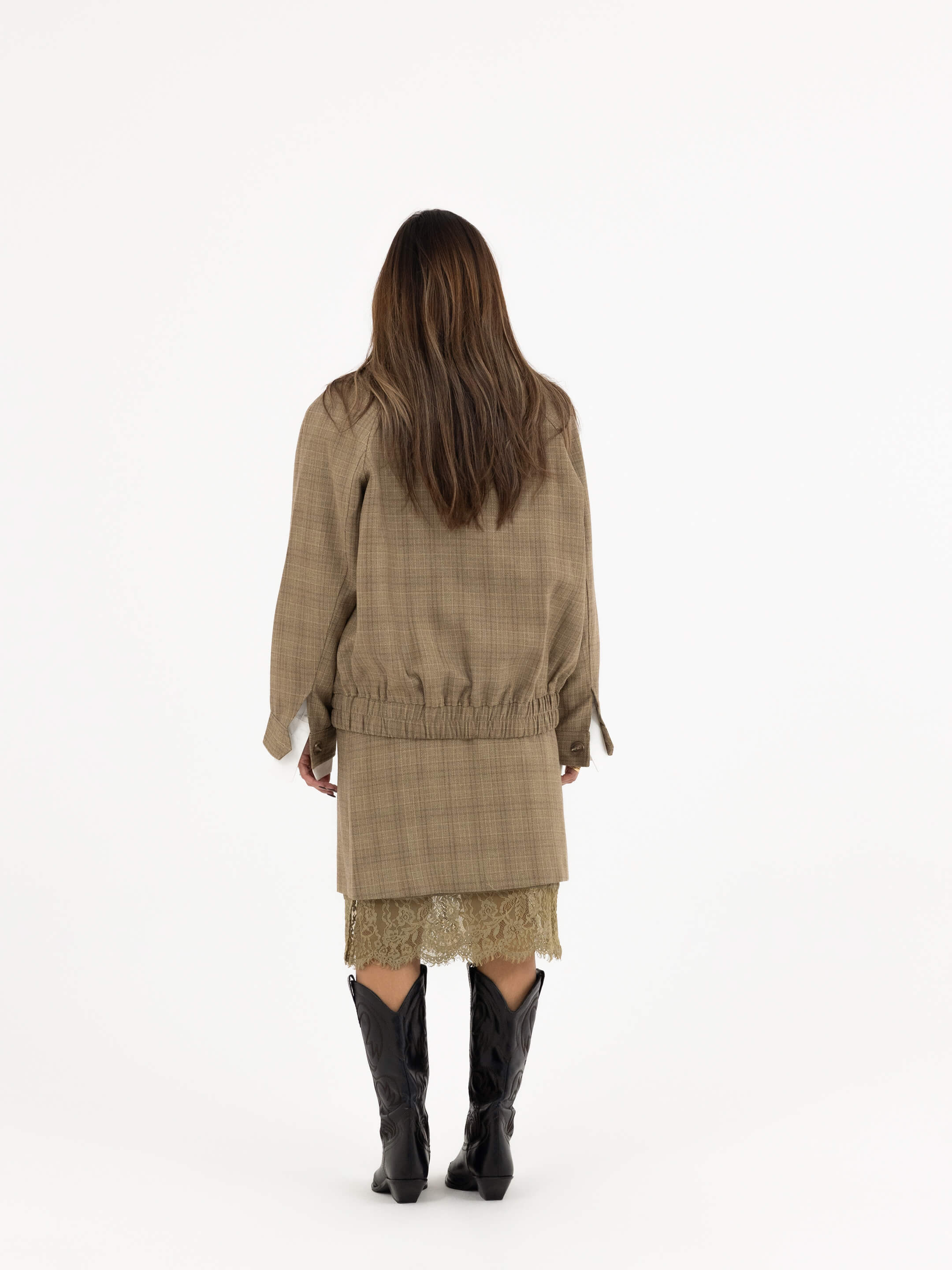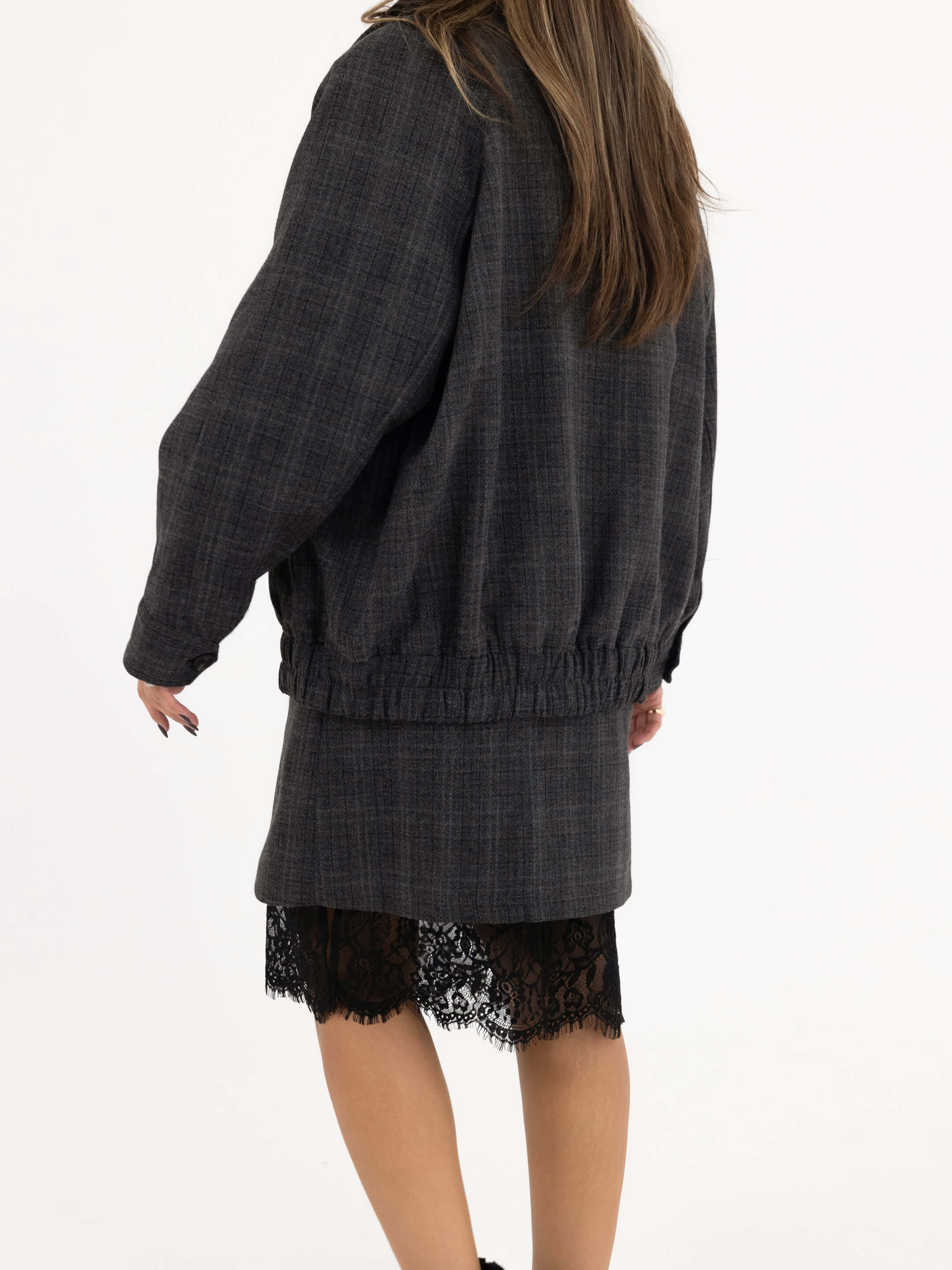 • Cut: Relaxed jacket, straight knee-length skirt
