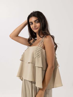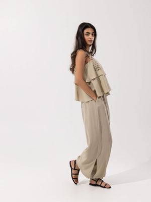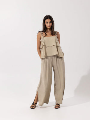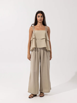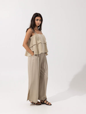 - Design: Two-piece set with a layered sleeveless top featuring decorative loop straps, paired with high-rise wide-leg pants with side slits