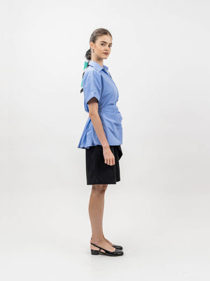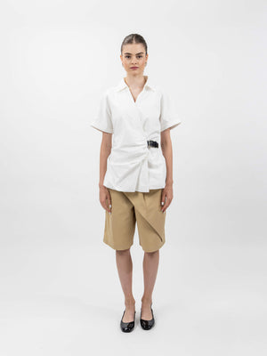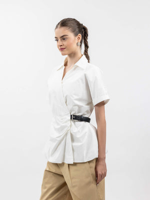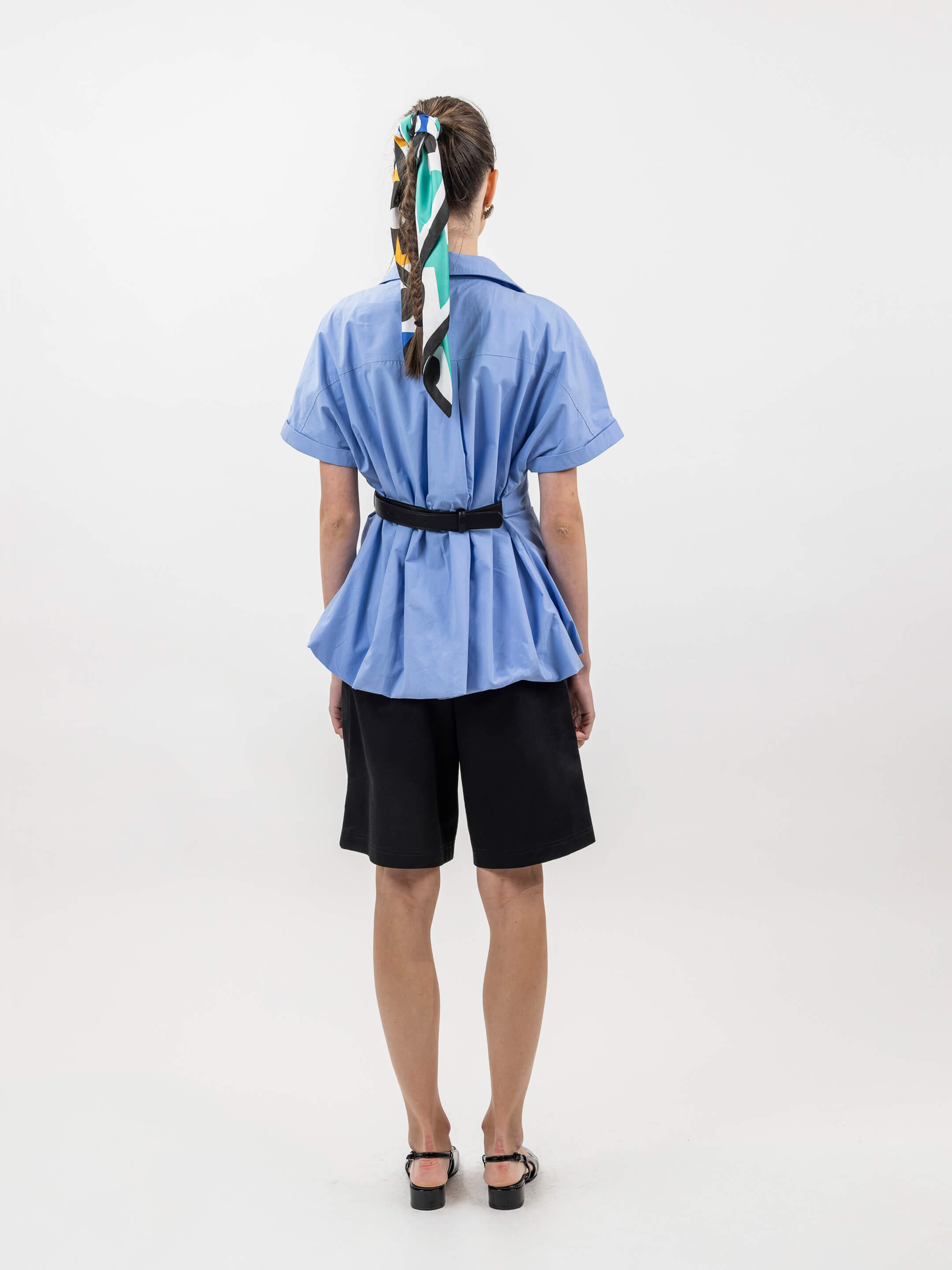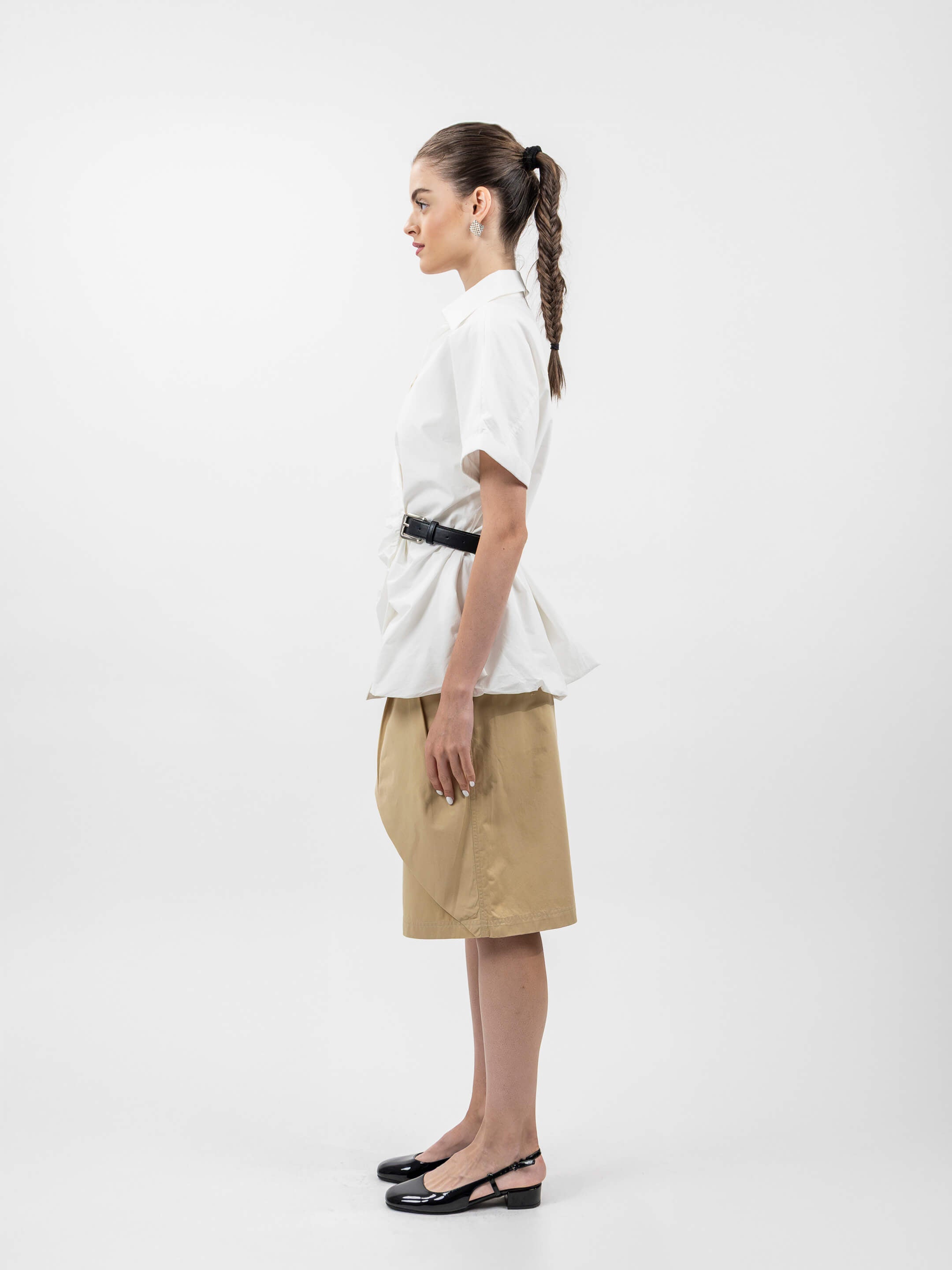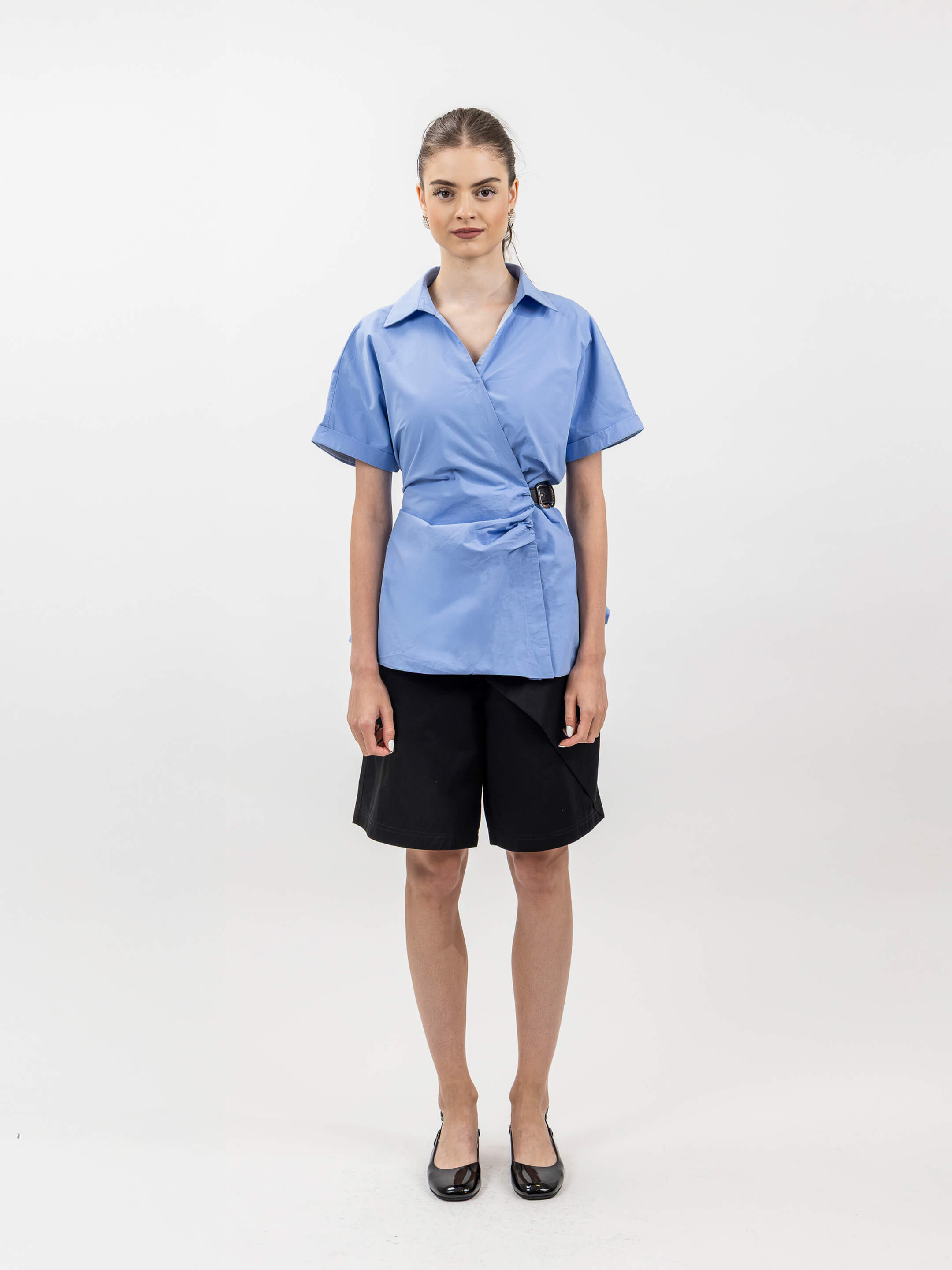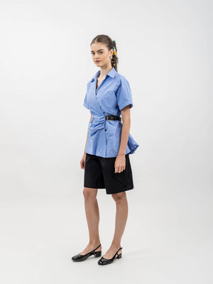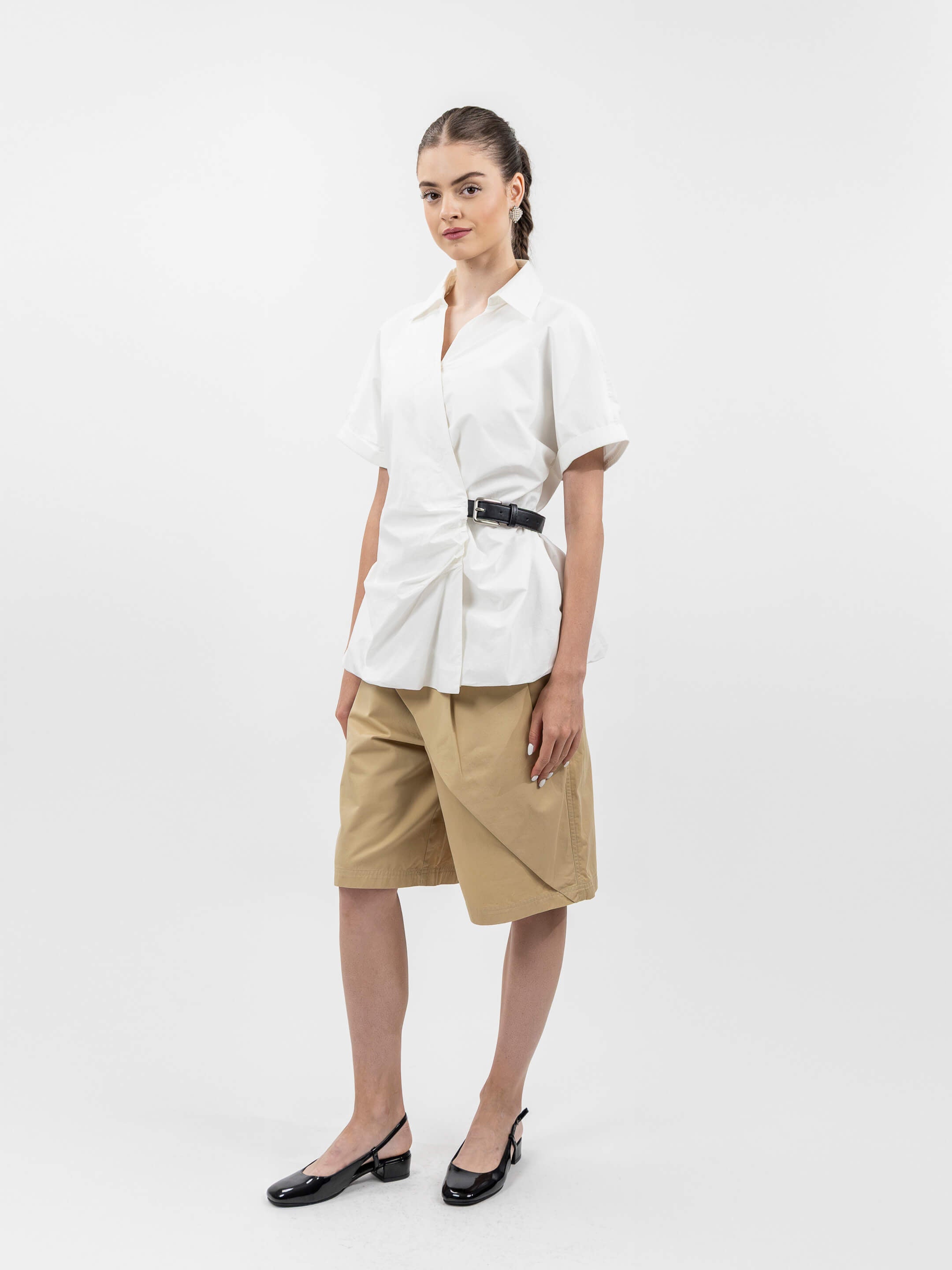 - Details: Adjustable belt with buckle at the waist for shape, short cuffed sleeves