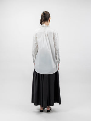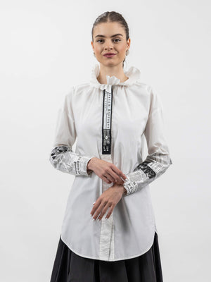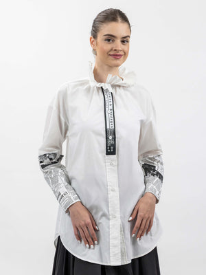 - Design: Long-sleeve shirt with ruffled high neckline and button-down front