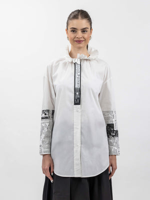 - Details: Newspaper-print panels on sleeves and placket, buttoned cuffs, lightweight finish