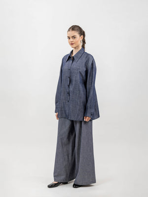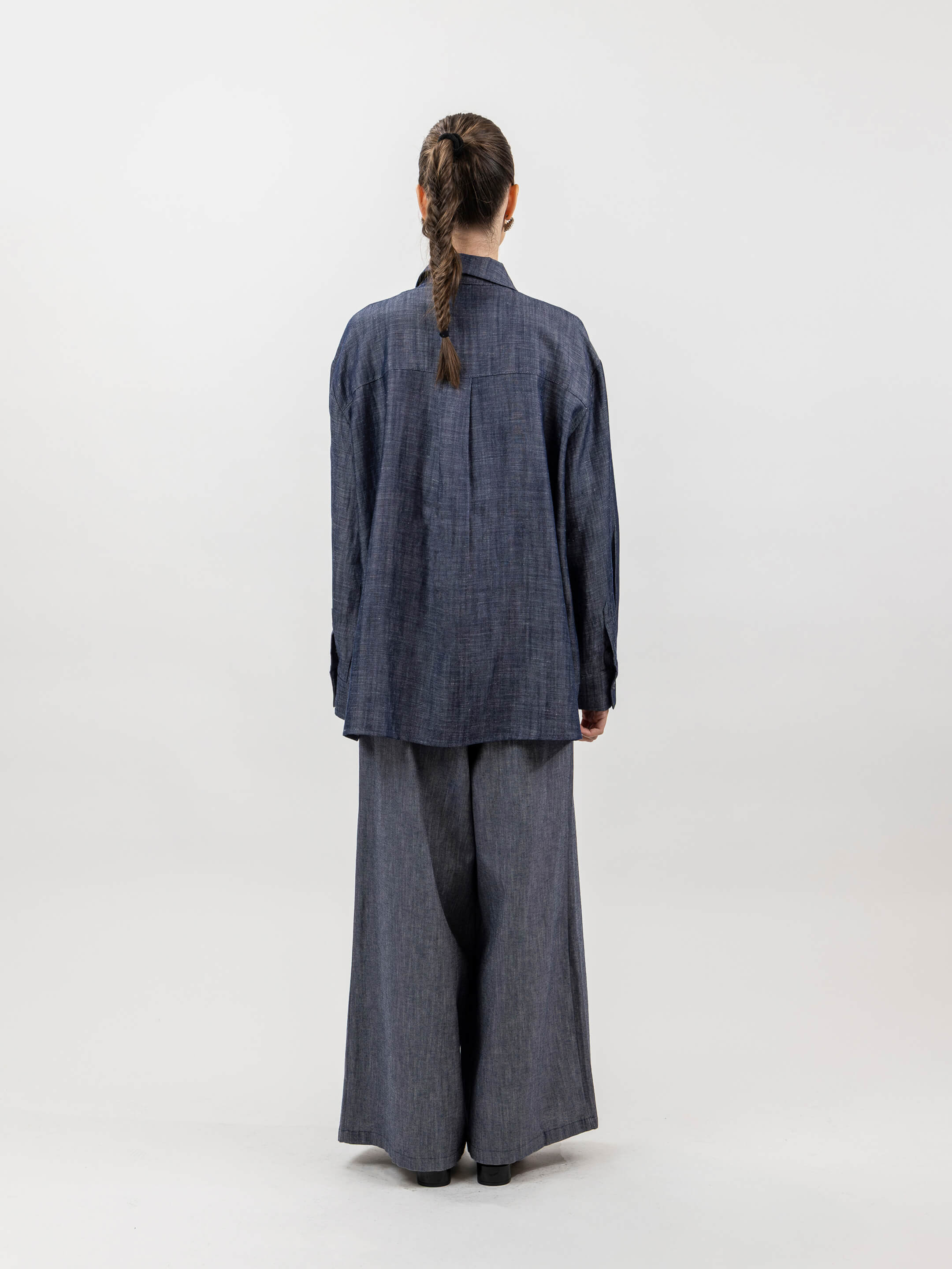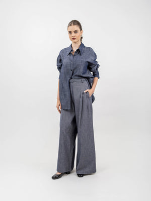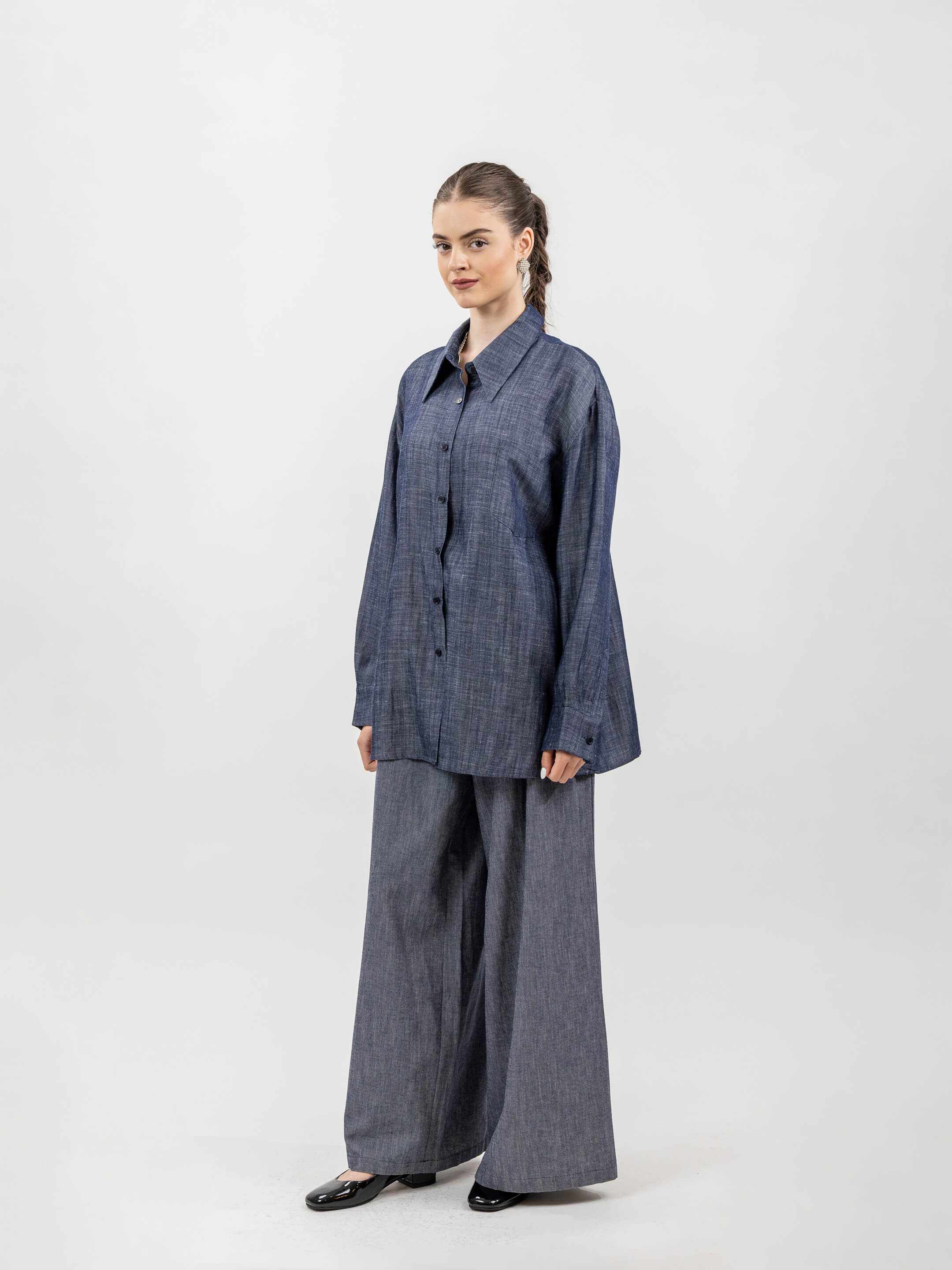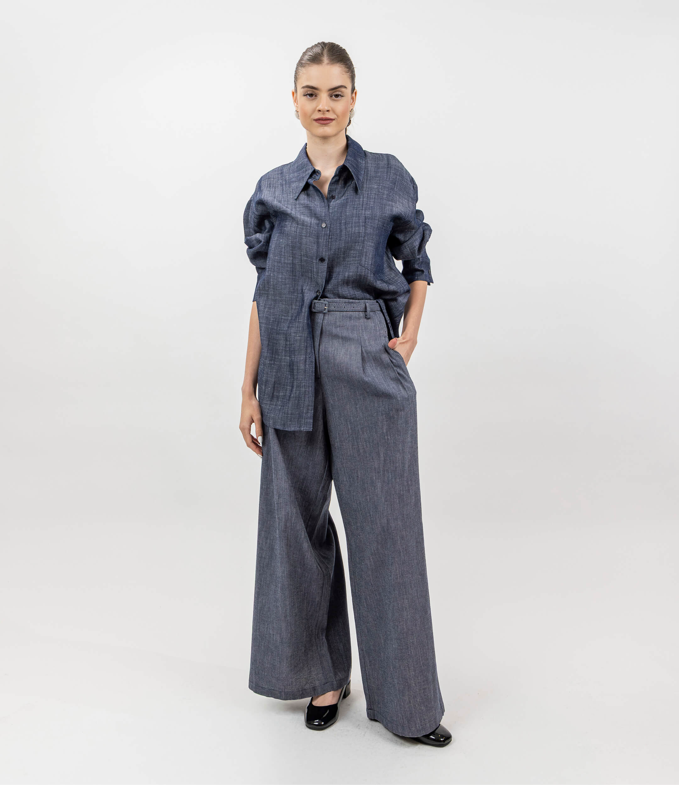 - Cut: Relaxed fit shirt with dropped shoulders, wide-leg pleated pants