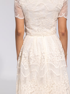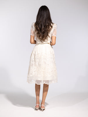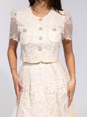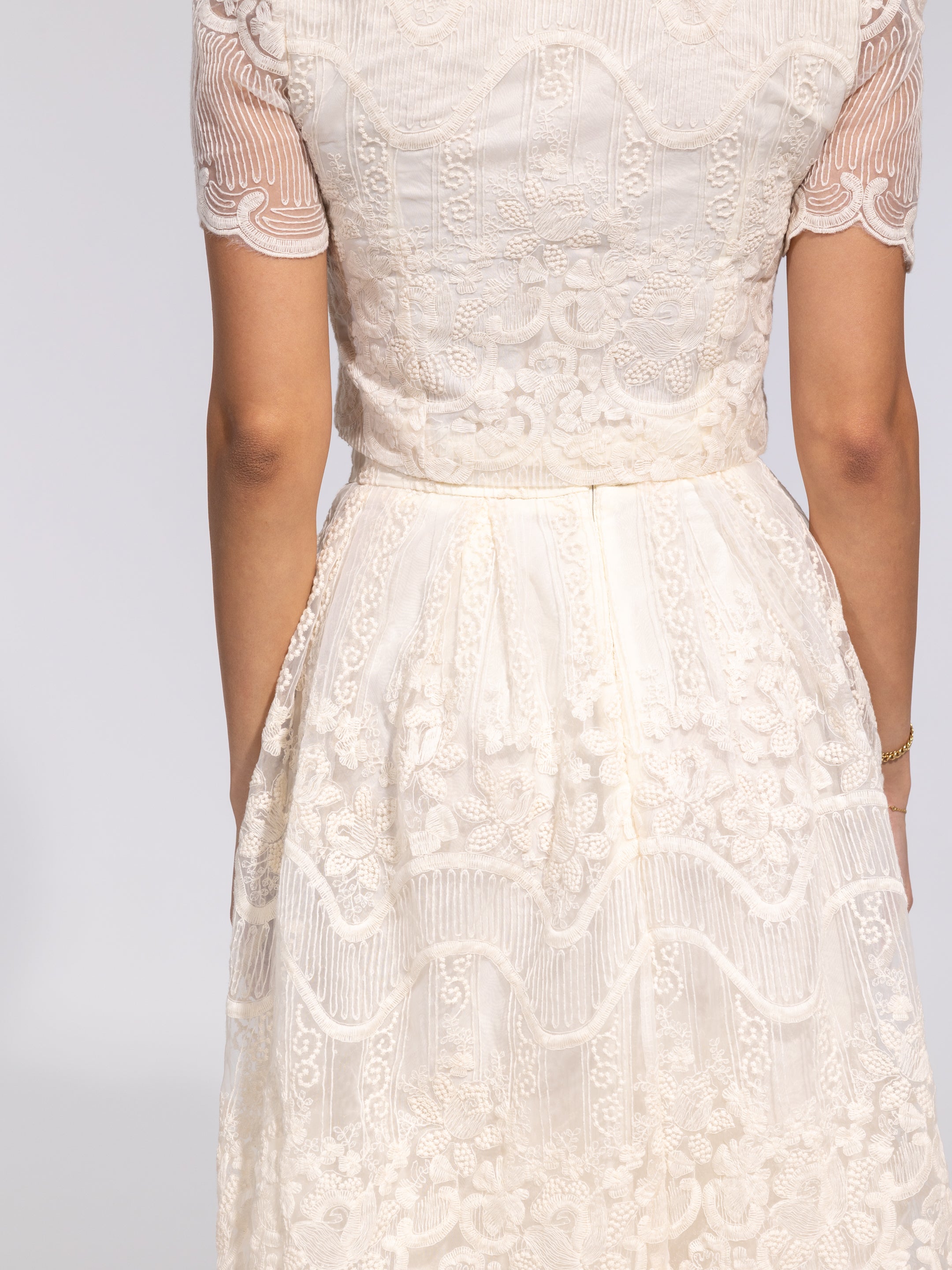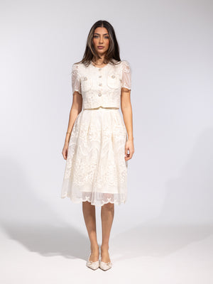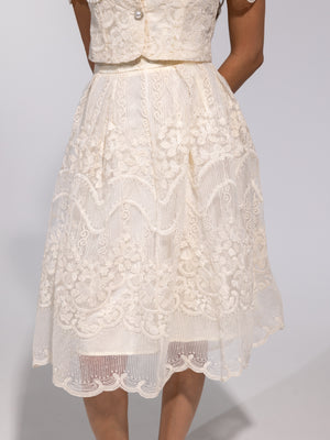 • Design: Two-piece lace set with cropped top and midi skirt