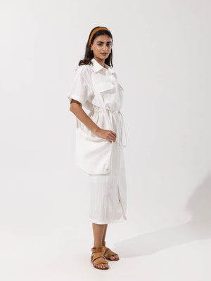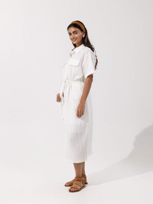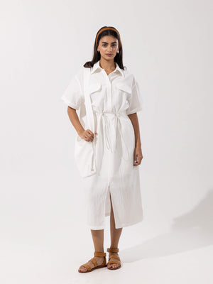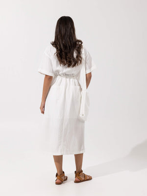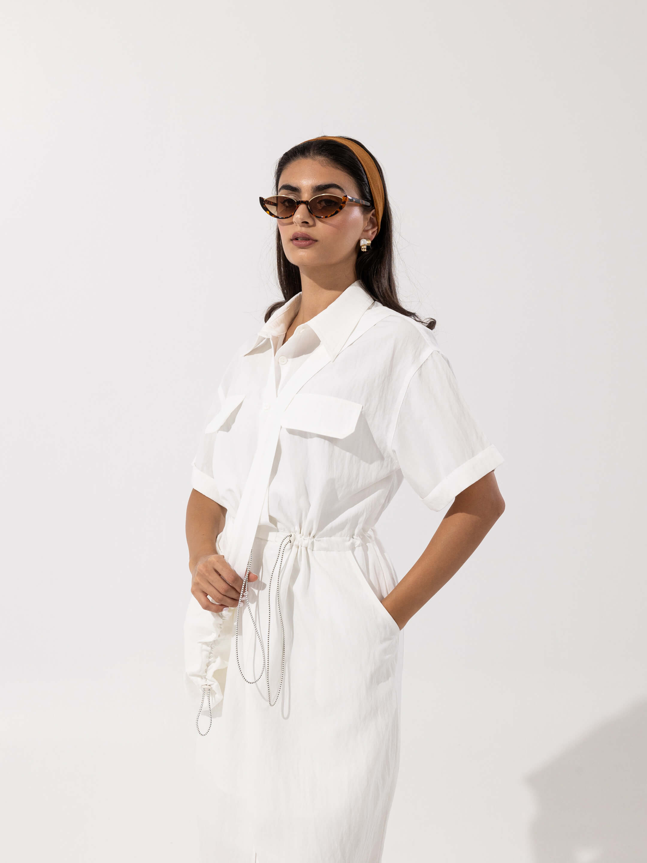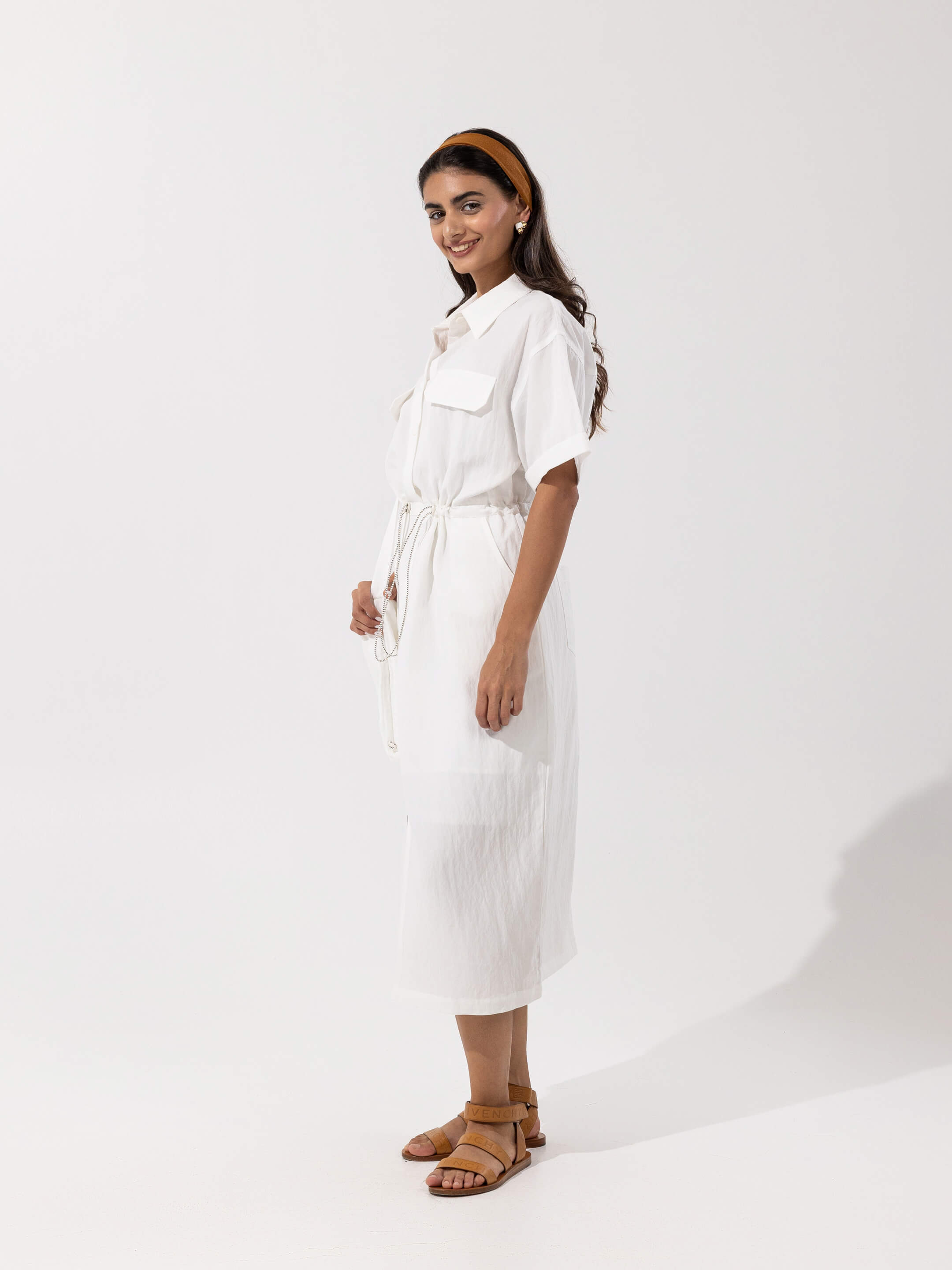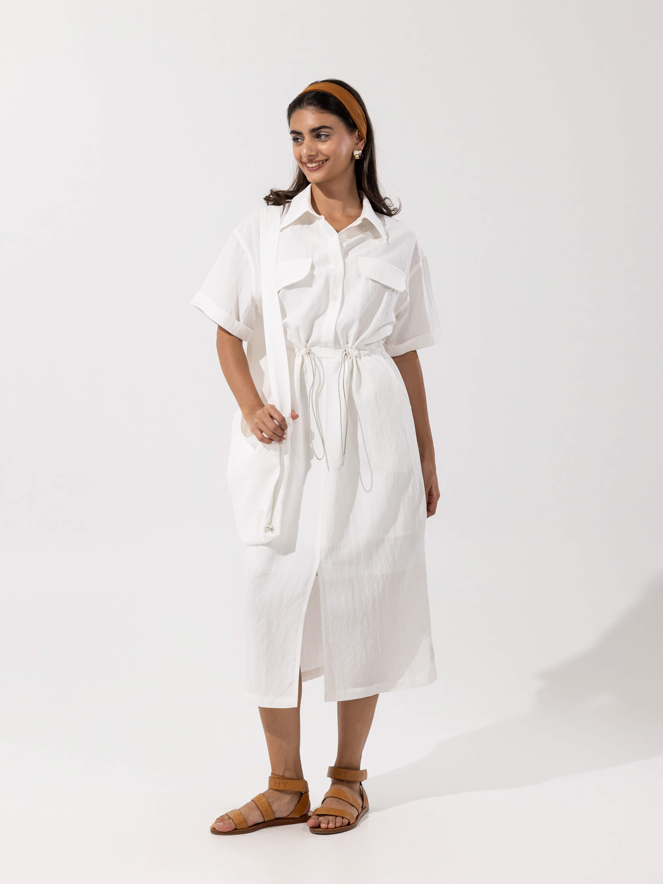 - Design: Shirt-style midi dress with short sleeves and functional flap pockets