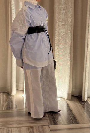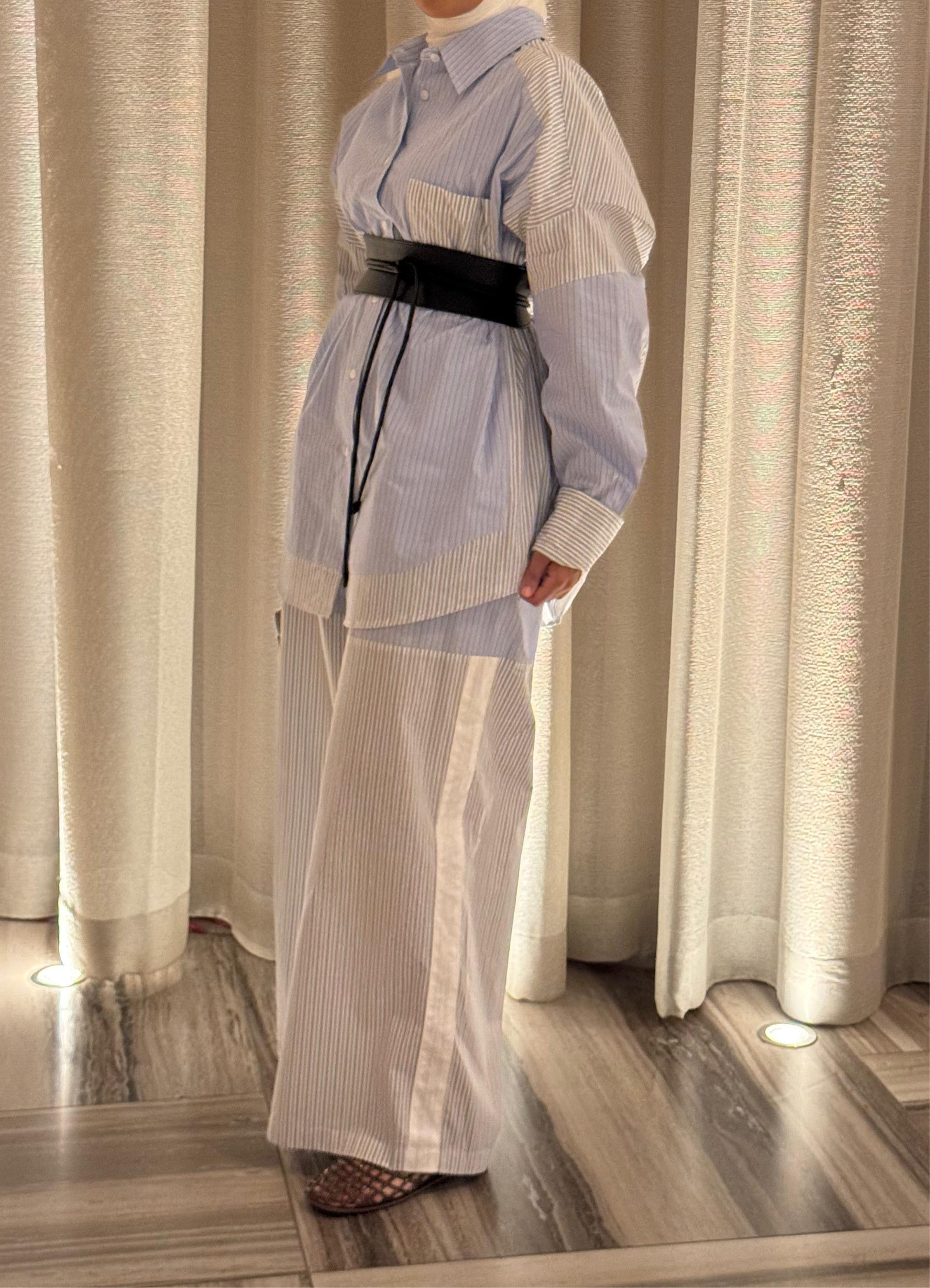 Design: Oversized shirt with matching wide-leg pants in patchwork stripes