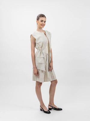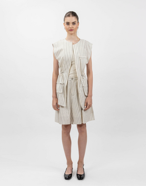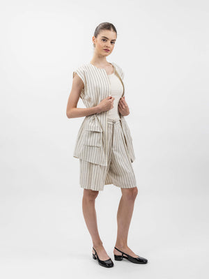 - Design: Two-piece set with a sleeveless zip-up vest and matching tailored shorts