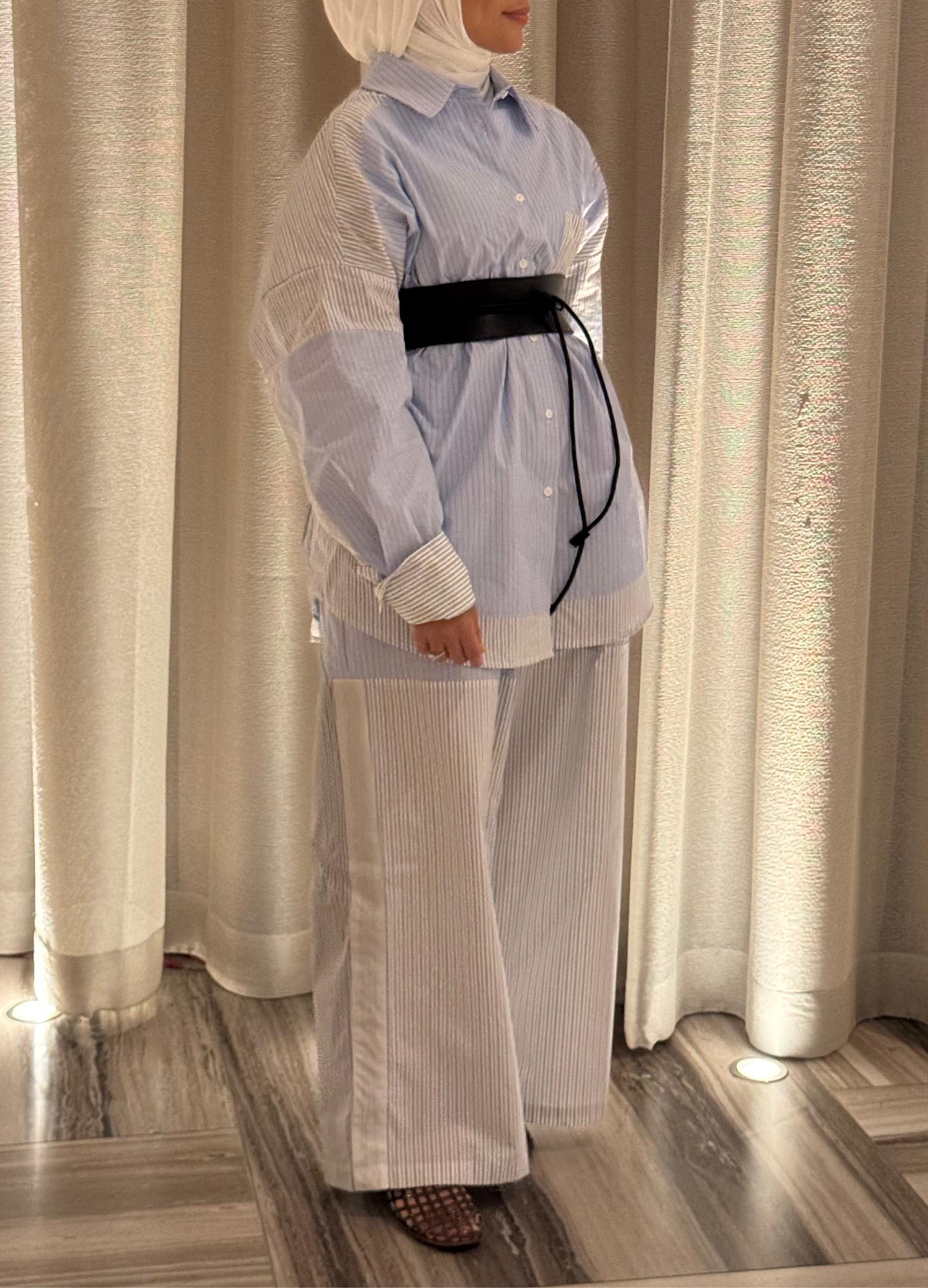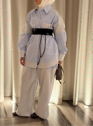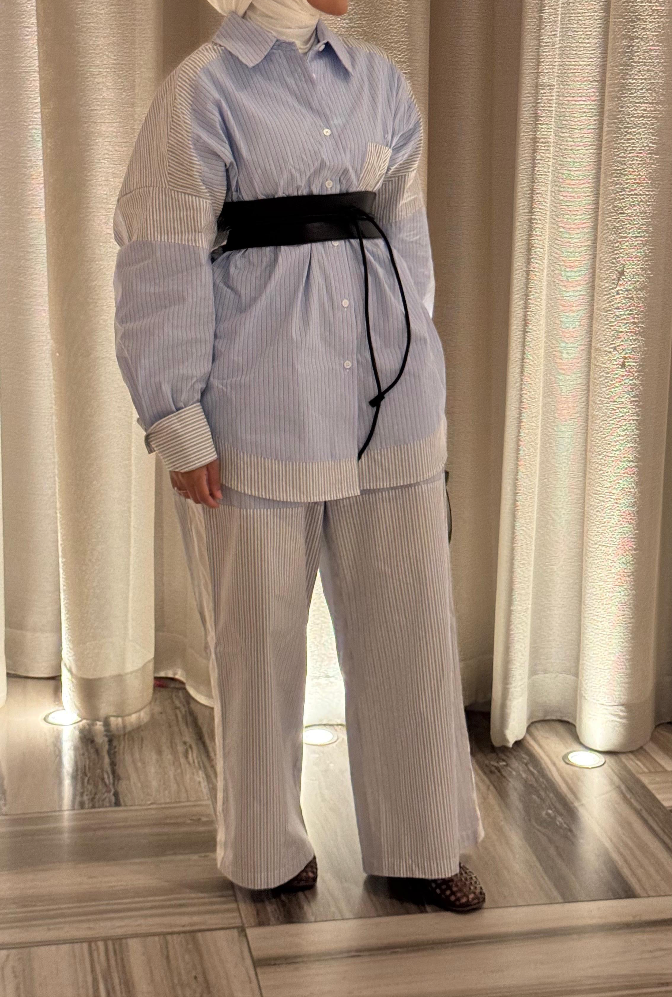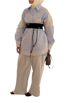 Design: Oversized shirt with matching wide-leg pants in patchwork stripes